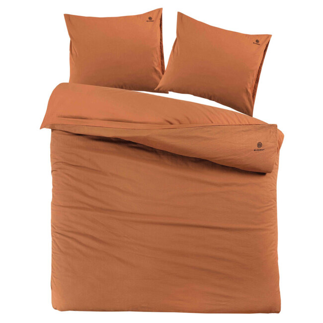 BLCKOUT dekbedovertrek Alberta is een effen dessin in de kleur roestbruin met een ingeweven reliëf, wat de stof een grovere touche geeft. De stoere, dubbele jeansnaden die gebruikt zijn voor zowel het overtrek als de kussenslopen versterken dit nog eens. Het BLCKOUT logo wordt zowel op het percal katoen dekbedovertrek als de slopen in de bovenhoek getoond.