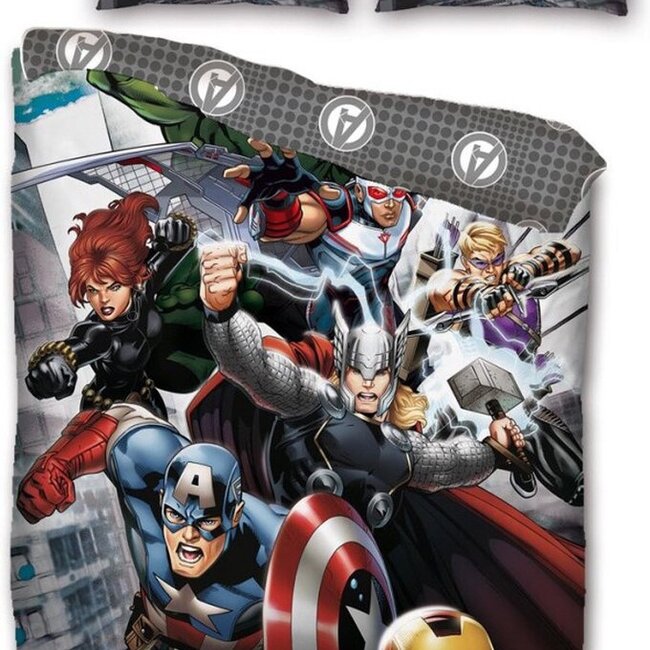 Het overtrek is dubbelzijdig bedrukt met op de ene zijde de grote print van The Avengers terwijl ze in volle vaart ten strijde trekken. De achterzijde van het dekbedovertrek heeft een grijs stippenpatroon met daartussen het Avengers logo. Daarmee kun je de bovenrand een stukje omslaan voor een speels effect. Het Avengers dekbedovertrek Assemble wordt geleverd als complete set met kussensloop, met daarop het Avengers logo tegen een achtergrond van wolkenkrabbers.