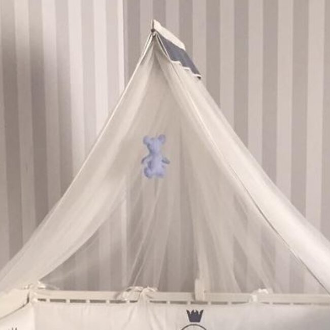 Het babyhemeltje in een prachtige babyblauwe kleur is een mooie toevoeging aan elke babykamer. Het hemeltje is afgewerkt met goud draad. Het hemeltje creëert een gezellige en knusse sfeer in de kamer en beschermt de baby tegen insecten. Het ontwerp is klassiek en past perfect bij een romantisch thema in de kamer. Het hemeltje kan gemakkelijk worden bevestigd boven het wiegje of ledikantje en geeft een extra touch aan de decoratie van de kamer. Dit babyhemeltje is een geweldig cadeau voor een aanstaande ouder en zorgt voor een veilige en comfortabele slaapomgeving voor de baby.