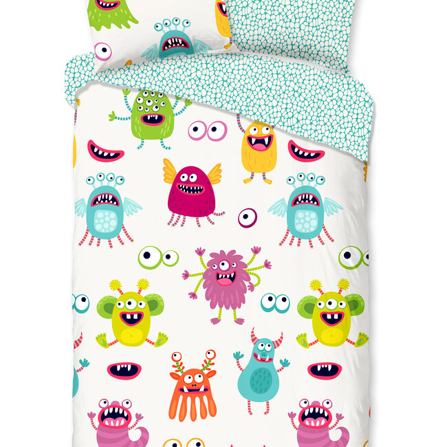 Ben jij gek op grappige monsters? Dan is het Good Morning Booh dekbedovertrek echt iets voor in jouw slaapkamer. Het overtrek staat vol met monstertjes in vrolijke kleuren. Samen met deze grappige, kleurrijke monsters wordt naar bed gaan elke dag een feestje! Even genoeg van monsters? Draai het dekbedovertrek dan om voor een effen mintgroen dessin vol stippen.