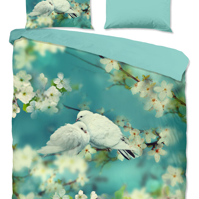 Good morning dekbedovertrek loving is een aqua dekbed overtrek met bloesem tak met 2 verliefde duiven.. Dekbedhoes van katoen. Lees meer.