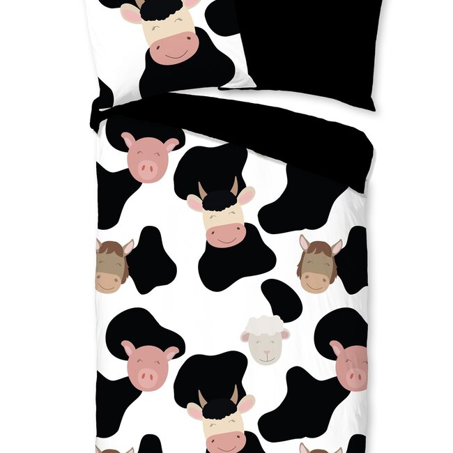 Good Morning dekbedovertrek met een afbeelding van koeien, varkens en paarden op een ondergrond van koeienvlekken. Dit dekbed overtrek is gemaakt van 100% katoen. Lees meer.