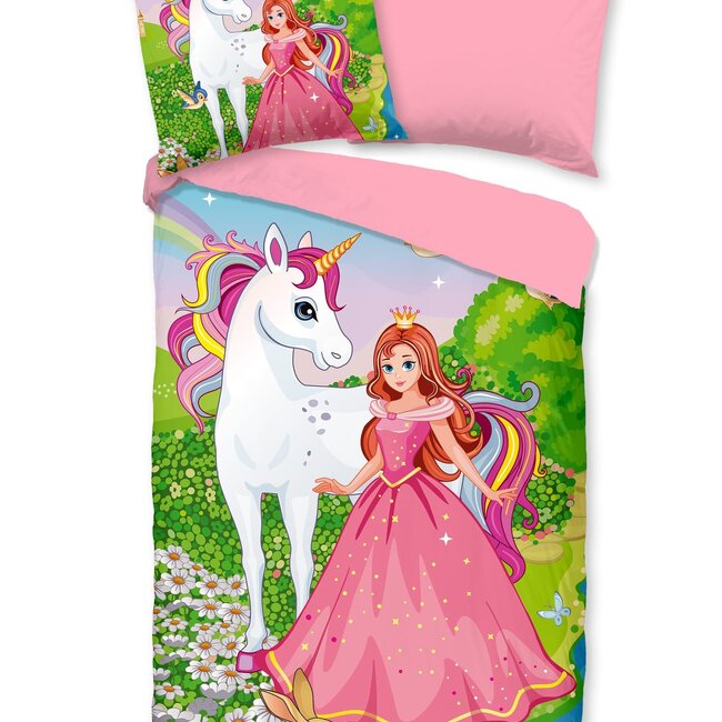 Good Morning Kinderdekbedovertrek Fairytale is een eenhoorn dekbedovertrek met afbeeldingen van een prinses en een unicorn.