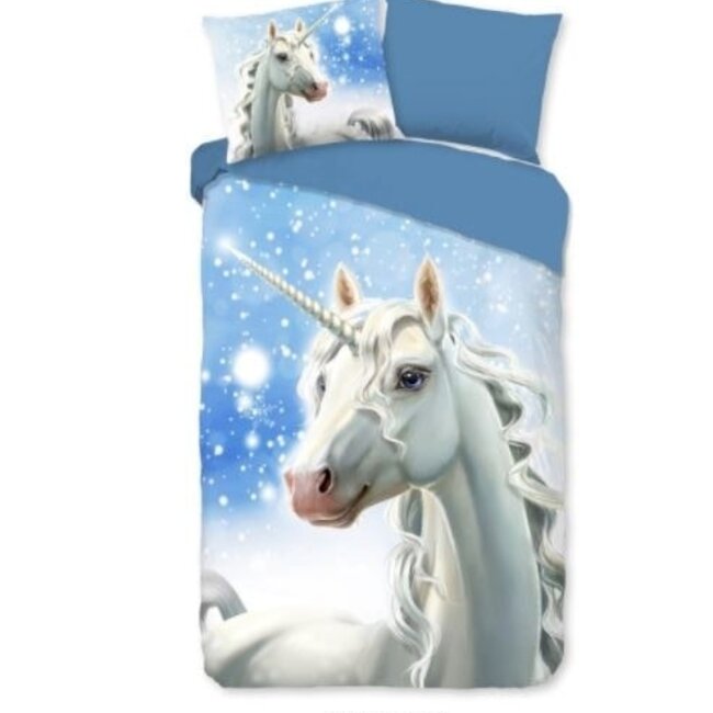 Het Freeze dekbedovertrek van Good Morning is een echte blikvanger! De witte eenhoorn met zijn betoverende blauwe ogen springt eruit tegen de blauwe achtergrond, terwijl de sneeuwvlokjes die door de lucht dwarrelen het magische effect versterken. De achterkant heeft een effen blauwe tint, zodat je eenvoudig van kant kunt wisselen of het dekbed open kunt slaan voor een strakke uitstraling. De prachtige eenhoorn en de effen kleur zijn ook terug te vinden op de bijpassende kussensloop.