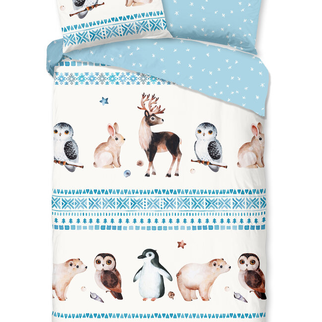 Maak je klaar voor de winter met het Good Morning Freezing flanel dekbedovertrek. Op het wit met blauwe dessin staan verschillende winterse dieren afgebeeld. Een ijsbeer, uilen, rendier, konijn en een pinguïn stelen de show. De achterkant van het overtrek is blauw van kleur met daarbij witte sterretjes.