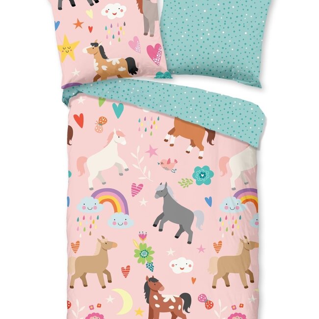Is jouw kleintje helemaal weg van paarden? Dan is dit té gekke dekbedovertrek van Good Morning perfect! Het Horses dekbedovertrek heeft een speelse, zoete print van paarden in verschillende kleuren. Daaromheen staan allemaal leuke tekeningen zoals hartjes, regenbogen en bloemetjes. De pastelroze ondergrond geeft het een zachte en lieflijke uitstraling. Op de blauwgroene achterzijde staat een ton-sur-ton stippenprint waardoor de enkele witte stipjes er extra uitspringen.