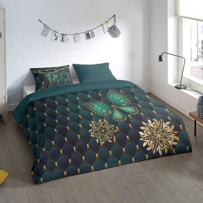 ✓ Elegant vlinder‑dessin op petrol ondergrond – geeft een rustige maar stijlvolle uitstraling in de slaapkamer.