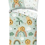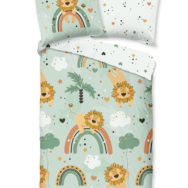 Het leeuwtjes dekbedovertrek van het merk Good Morning is perfect voor de kinderkamer! Het dessin bestaat uit een schattige, speelse print van leeuwtjes en regenbogen. Het overtrek heeft een zacht kleurenpalet met pastel groen, oranje en wit. Op de achterkant staat een patroon van hartjes, sterretjes en stippen in dezelfde tinten op een witte ondergrond.