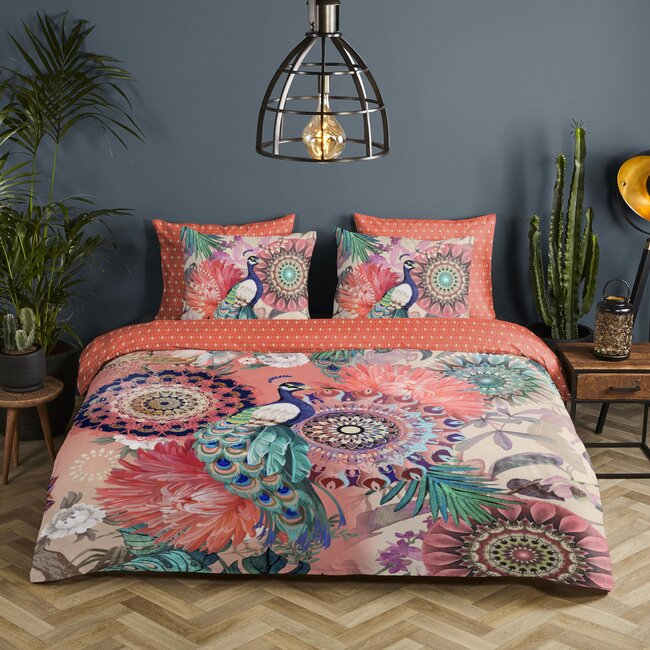 Het Lynouk dekbedovertrek van HIP brengt direct een vrolijke en elegante sfeer in je slaapkamer. Het dessin toont sierlijke mandala’s en grote bloemen, met centraal een prachtige pauw als blikvanger. De zalmroze achtergrond zorgt voor een romantische uitstraling en komt prachtig tot zijn recht in combinatie met de blauwe, groene en witte accenten. De achterzijde is voorzien van een geometrisch patroon in dezelfde warme zalmroze tint. Ook de bijpassende kussenslopen zijn dubbelzijdig bedrukt, zodat je speels kunt variëren.