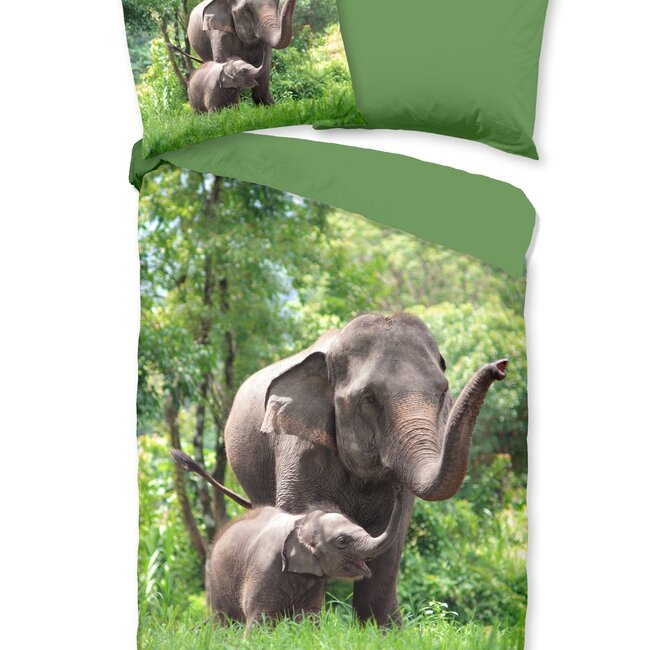 Good morning dekbedovertrek Olifanten is een groen dekbedhoes met een olifant met jong in de jungle. Dekbed overtrek is gemaakt van 100% katoen. Lees meer.