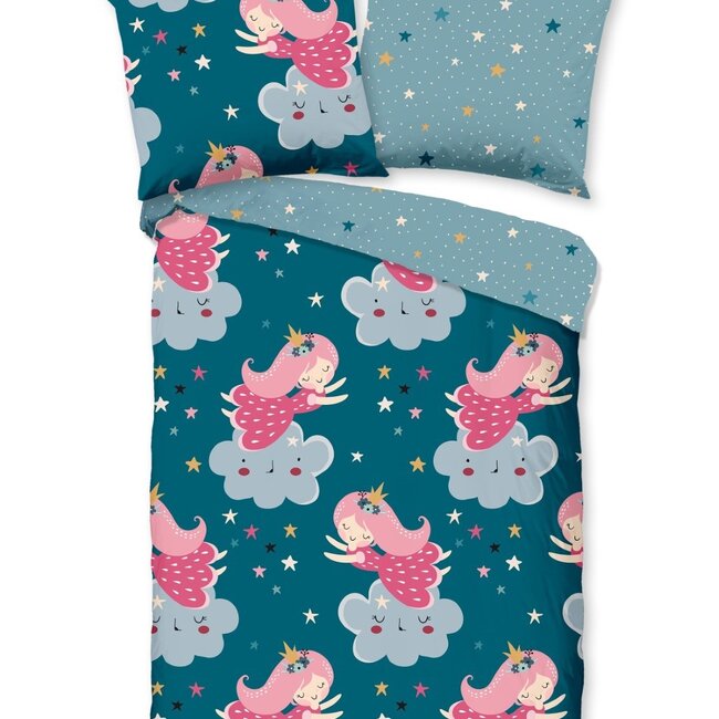 Laat jouw kleine prinses heerlijk wegdromen onder dit Good Morning Princess dekbedovertrek. De print bestaat uit kleine roze prinsesjes en schattige wolkjes op een petrol kleurige ondergrond. De roze, gele en witte sterretjes eromheen zorgen voor een sprankelend geheel. En wil je zelf als prinses in het middelpunt staan? Draai het overtrek dan om en droom van de grootste avonturen tussen een vrolijke sterrenprint op een lichtere blauwe ondergrond.