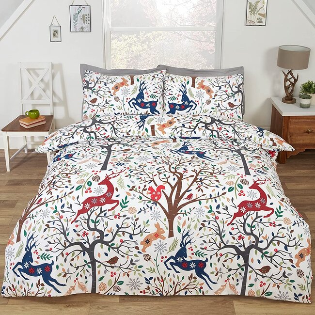 Finest Homeware dekbedovertrek Tatton is een dekbedovertrek met springende herten tussen de bomen en struiken, het heeft ook schattige kleine konijnen en eekhoorns.
