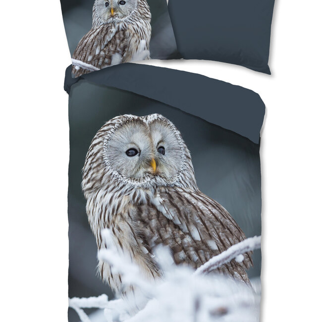 Good Morning dekbedovertrek van 100% katoen met een print van een Uil op een besneeuwde tak met een donker grijze ondergrond. Lees meer.