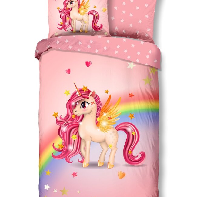 Good morning dekbedovertrek met afbeeldingen van een eenhoorn en regenboog met sterren en hartjes. Het beddengoed is gemaakt van 100% katoen. Lees meer.