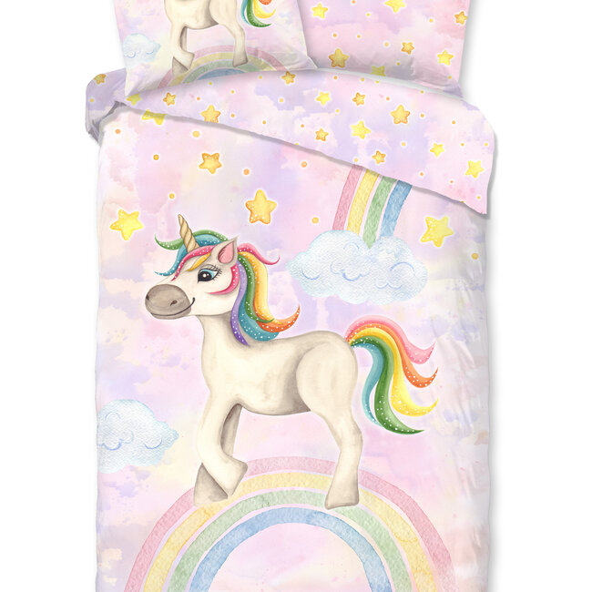 Met het Good Morning Unisweet dekbedovertrek slaap je elke nacht heerlijk in een magische sfeer. Op het roze overtrek loopt een eenhoorn over een regenboog tussen de wolken, met kleurrijke lokken voor een vrolijk effect. Rondom de eenhoorn zijn verschillende sterren te zien. De achterkant van het overtrek heeft een schattige roze wolkenprint met sterretjes.