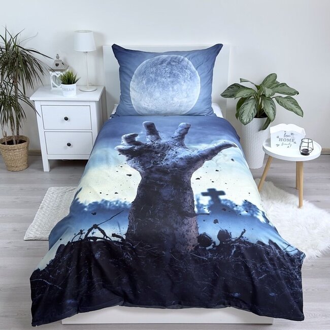 Dekbedovertrek met afbeelding van een zombie hand die uit de grond komt. Gemaakt van polyester. Kan dubbelzijdig gebruikt worden. Lees meer.