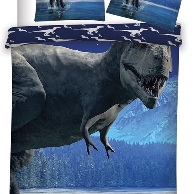 Beleef de meest gave prehistorische avonturen met dit prachtige dinosaurus dekbedovertrek! Speciaal voor alle T-Rex fans, want deze imposante dinosaurus speelt hierop de hoofdrol. Door de grote print van een T-Rex in een prehistorisch landschap tover je de kinderkamer om tot een waar Jurassic Park!