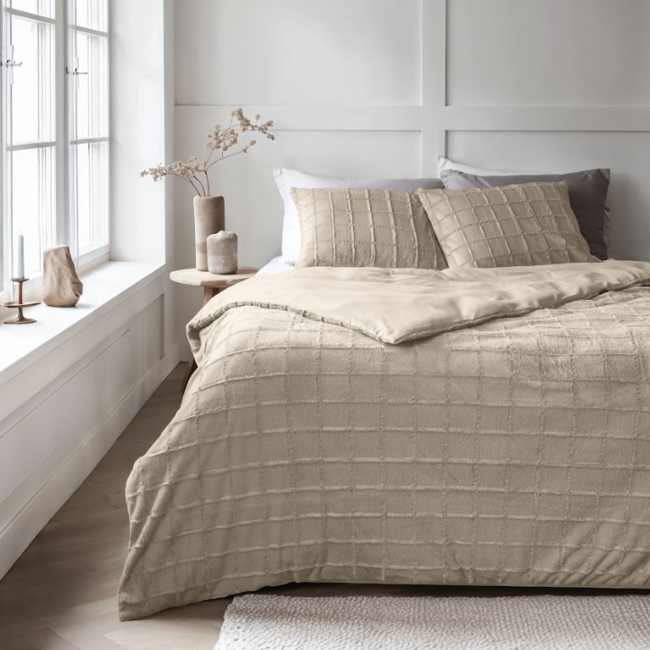 Ervaar het ultieme comfort met het Sleeptime Faux Fur Check dekbedovertrek beige. Dit dekbedovertrek is gemaakt van heerlijk fake faux fur stof aan de bovenzijde en soepele microvezel aan de onderkant. De combinatie van deze materialen zorgt voor een warm en knus gevoel, perfect voor de koude nachten. Daarnaast geeft de nep bont stof een luxe uitstraling aan je slaapkamer.