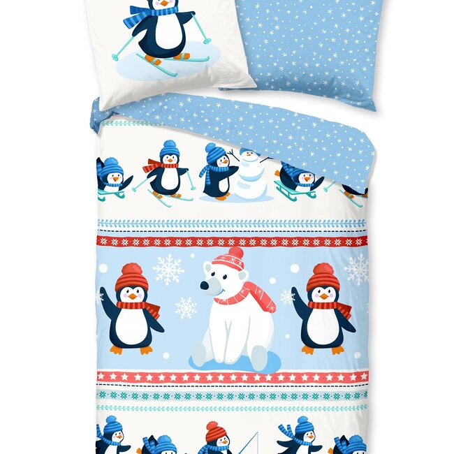 Good morning flanel dekbedovertrek Penguins is een dekbedhoes met een print van Penguins en ijsbeer die pret maken in de sneeuw.
