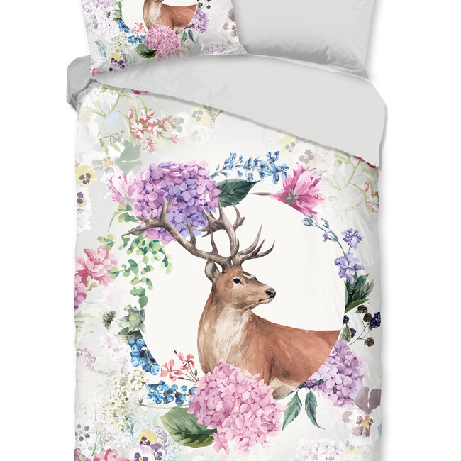 Good morning flanel dekbedovertrek Vedet is een prachtige dekbedhoes met een print van een hert in een cirkel van bloemen zoals hortensia's.