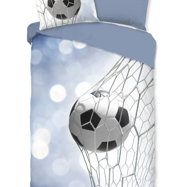 Geef je slaapkamer een sportieve uitstraling met dit opvallende dekbedovertrek met voetbalthema. Het dynamische ontwerp toont een voetbal die precies in het net belandt, perfect voor echte voetbalfans. Dankzij het realistische beeld lijkt het alsof je midden in een spannende wedstrijd zit. De bovenkant in effen blauw zorgt voor een rustige balans met het energieke dessin. Dit dekbedovertrek is een echte blikvanger voor iedere sportieve kamer.