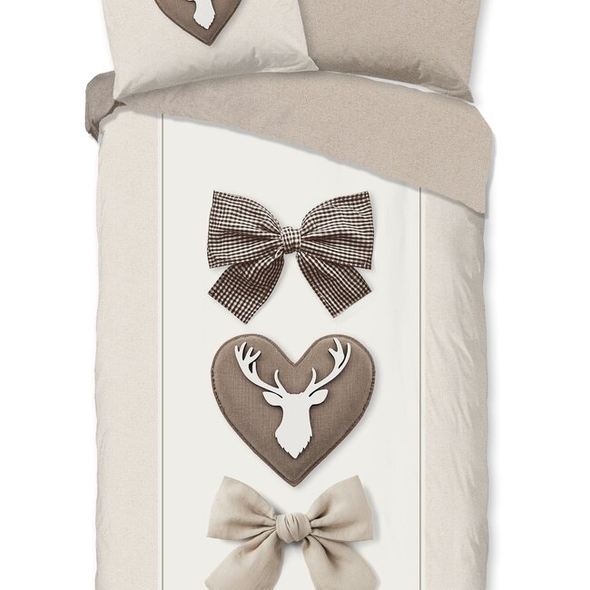 Breng extra warmte en gezelligheid in je slaapkamer met het Good Morning Siff flanellen dekbedovertrek. Dankzij de zachte flanelstof voelt dit overtrek behaaglijk aan, ideaal voor koude nachten. Het dessin met rustieke motieven zoals een hert in hartvorm en subtiele strikdessins geeft een landelijke uitstraling en oogt sfeervol. Of je nu een eenpersoon‑, tweepersoons‑ of lits‑jumeaux‑bed hebt, dit overtrek past in elke setting en belooft comfort én stijl.