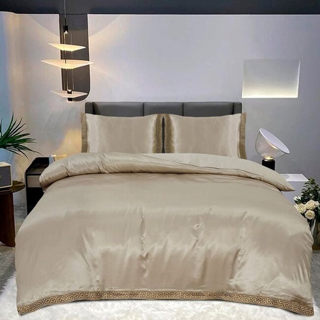 Dankzij de speciale weeftechniek liggen de garens uitzonderlijk dicht op elkaar, wat resulteert in een soepele, fijne en duurzame stof met een schitterende afwerking. De verfijnde lace rand is voorzien van een klassieke Griekse sleutel (meanderpatroon), geïnspireerd op de iconische stijl van Versace – een waar statement van luxe en tijdloze klasse.