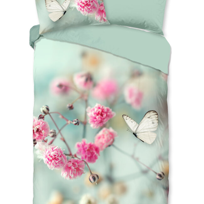Het Good Morning dekbedovertrek Adel is een fris mintgroen dekbedovertrek met een prachtige print van roze bloemen en een witte vlinder. Aan de andere zijde van het dekbedovertrek is het effen mintgroen van kleur. Dit dekbedovertrek wordt geleverd met een bijpassende kussensloop van 60x70 cm.