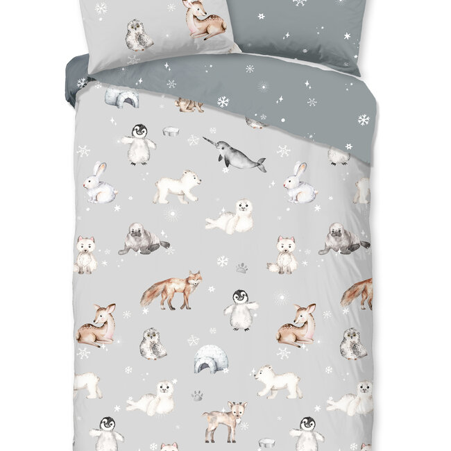Met het leuke Cira dekbedovertrek van Good Morning ben jij helemaal winterproof! Dit grijze dessin bevat een lieve print vol pinguïns, zeehondjes, vossen, hertjes en ijsberen. Voor een speels effect zie je over het beddengoed heen kleine sneeuwvlokken en pootafdrukken. De afbeelding loopt ook door de bijbehorende kussensloop die standaard wordt meegeleverd. En wil je na een tijdje weer iets anders op je bed? Sla dan het overtrek om naar de andere kant, want de achterzijde heeft een grijze kleur met witte sneeuwkristallen. Zo kun je het beddengoed op verschillende manieren gebruiken!