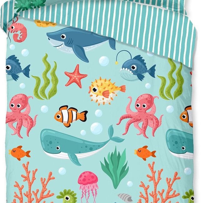 Met het vrolijke Good Morning Ocean dekbedovertrek droom je elke avond heerlijk weg naar de onderwaterwereld. Het blauwe dessin staat vol met speelse illustraties van oceaandieren – van walvissen en zeepaardjes tot schildpadden, vissen en andere kleurrijke zeevrienden. Laat je meevoeren langs roze zeesterren, luchtbelletjes en prachtig koraal. De achterkant van het overtrek én het kussensloop zijn voorzien van een stijlvol blauw-wit streepjespatroon, wat zorgt voor een frisse, maritieme touch.