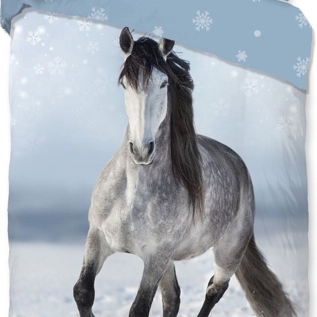 Het Good Morning Dreamer flanellen dekbedovertrek is perfect voor paardenliefhebbers en brengt een vleugje winterse magie in je slaapkamer. Op het blauwe overtrek prijkt een prachtig galopperend paard met zwarte manen, rennend door een besneeuwd landschap – wat zorgt voor een sfeervolle, winterse uitstraling. Sla je het dekbed een stukje open, dan komt de achterzijde met speelse sneeuwvlokken tevoorschijn, wat het geheel mooi aanvult. Ook de kussenslopen zijn dubbelzijdig bedrukt, waardoor je het beddengoed op verschillende manieren kunt stylen.