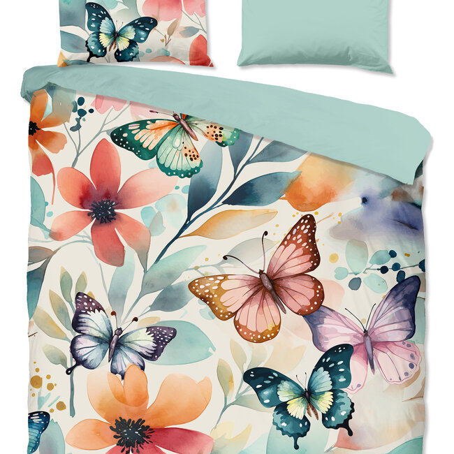 Het Good morning dekbedovertrek Vallee is een prachtig mint dekbedovertrek met een betoverende print van bloemen en vlinders. Dit themadekbedovertrek voegt een vleugje natuurlijke schoonheid en sereniteit toe aan je slaapkamer.
