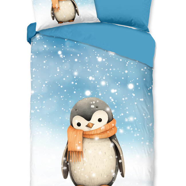 Breng een vleugje wintermagie in je slaapkamer met het Pingi dekbedovertrek van Good Morning. Op het dessin prijkt een schattige pinguïn met een vrolijk oranje sjaaltje, omringd door zacht neerdwarrelende sneeuwvlokken – alsof je midden in een winters sprookje bent beland. De bijpassende kussensloop toont dezelfde lieve pinguïn in een besneeuwd landschap. Voor een rustige touch is de achterzijde van zowel het dekbedovertrek als de kussensloop uitgevoerd in effen blauw. Een knusse en sfeervolle keuze voor de koude maanden!