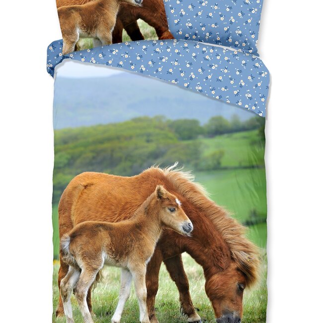 Ben jij dol op paarden? Dan mag het Good Morning Regine dekbedovertrek zeker niet ontbreken in jouw slaapkamer! Het blauwe dessin is voorzien van een prachtige fotoprint van een shetlandpony met haar veulentje, gezellig grazend in het gras. De achterzijde van het overtrek is uitgevoerd in blauw met schattige witte bloemetjes. Het kussensloop combineert beide prints, zodat je lekker kunt variëren en combineren voor een speels effect.
