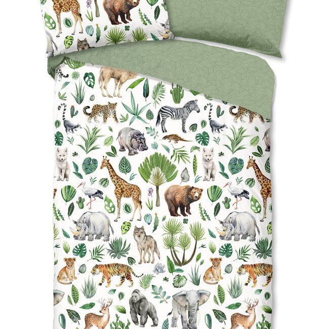 Ben jij gek op dieren? Dan is het Good Morning Samba dekbedovertrek een absolute must voor jouw slaapkamer! Met zijn Afrikaanse uitstraling, vol weelderige groene bladeren en een bonte verzameling wilde dieren zoals tijgers, olifanten, neushoorns en zebra’s, brengt dit overtrek de jungle tot leven. Sla het dekbed een stukje om en ontdek een stijlvolle groene bladerprint aan de achterzijde. Beide dessins komen ook terug op het bijpassende kussensloop, voor een speels en harmonieus geheel.