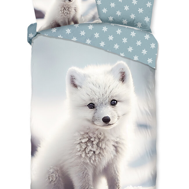 Het dekbedovertrek heeft een afbeelding van een wit poolvosje op een witte achtergrond, met aan de achterkant een blauwe kleur en witte sneeuwvlokken. Dit geeft een frisse en winterse uitstraling aan de slaapkamer.