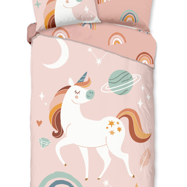Onder dit leuke Good Morning Unidance dekbedovertrek val je iedere avond heerlijk in slaap. Het roze dessin heeft een lieve print met een sierlijke eenhoorn, sterren, planeten, een maan en een regenboog. De zachte pastelkleuren komen prachtig naar voren op de lichte ondergrond. Sla je het overtrek om, dan bevat de achterzijde een roze tint vol schattige regenboogjes. Zo kun het beddengoed op meerdere manieren gebruiken!