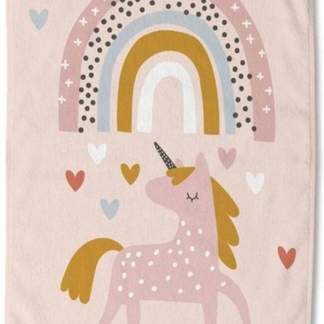 Good Morning strandlaken met print van een unicorn, regenboog en hartjes.