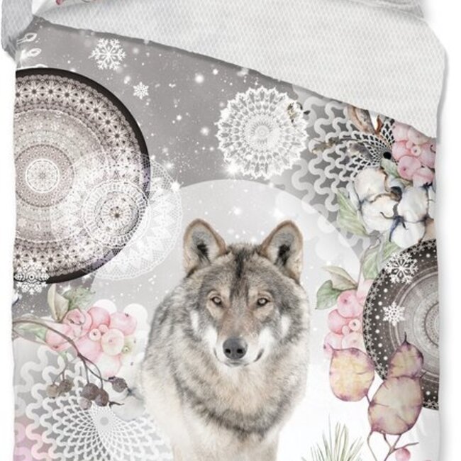 Het Isaci flanellen dekbedovertrek van HIP Collection is een echte sfeermaker in de slaapkamer. Het grijze dessin is versierd met een trendy mix van bloemen, mandala’s en als blikvanger een prachtige wolf in het midden. Tussen de motieven dwarrelen subtiele sneeuwkristallen, wat zorgt voor een dromerige winterse touch. De combinatie van zachte grijstinten en lichtroze bloemen creëert een warme, rustgevende sfeer. De achterzijde is lichtgrijs met een verfijnd patroon, perfect voor een stijlvolle afwisseling.