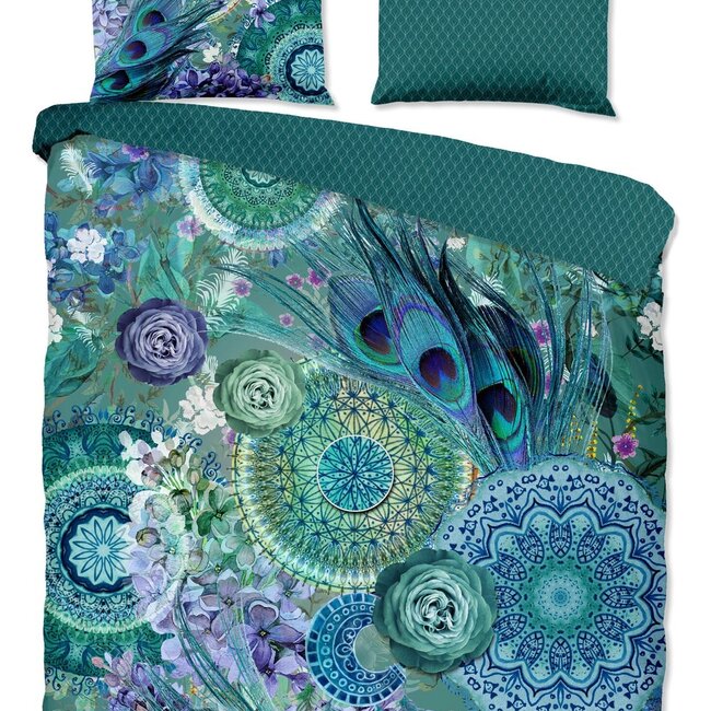 Het Kari dekbedovertrek van HIP Collection tovert je bed om tot een echt kunstwerk. Het groene dessin is rijk versierd met bloemen in tinten van groen, blauw en paars, gecombineerd met sierlijke mandala’s en elegante pauwenveren. De gelaagde opbouw van de print zorgt voor een speelse, levendige uitstraling. De achterzijde heeft een rustige groene kleur met een subtiel grafisch patroon, ideaal om mee af te wisselen en je bed op verschillende manieren te stylen.