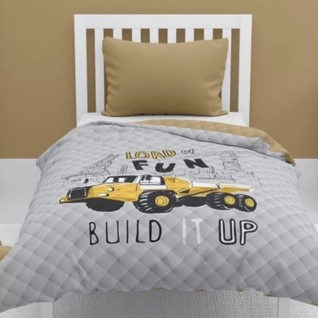 Bedsprei Build it up. Deze sprei is een mooie aanvulling in stoere kinderkamer! Deze beddensprei is oker geel aan de achterkant. Hierdoor kunt u de sprei dubbelzijdig gebruiken. Lees meer.