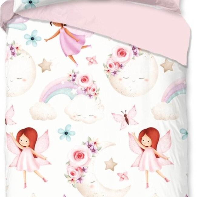 Geef de slaapkamer van je kind een vrolijke, speelse uitstraling met het Lucia dekbedovertrek! Dit schattige dekbedovertrek heeft een sprankelende roze achtergrond vol kleurrijke feeën, regenbogen bloemen en maantjes, perfect voor kleine dromers die van elfjes en fantasierijke prints houden. De achterkant is voorzien van een schattige roze kleur, zodat je het dekbedovertrek gemakkelijk kunt omdraaien voor een frisse nieuwe look.