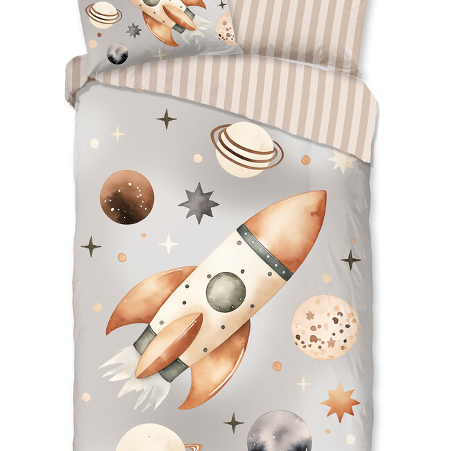 Breng avontuur naar de kinderkamer met dit vrolijke dekbedovertrek met een ruimtevaartthema. De kleurrijke raket en planeten zorgen voor een speelse en fantasierijke uitstraling. Ideaal voor kleine astronauten die dromen van verre sterren en spannende ruimtereizen. De gestreepte achterkant geeft een verrassend stijlvol accent aan het geheel. Maak van bedtijd een reis door het heelal met dit unieke ontwerp.