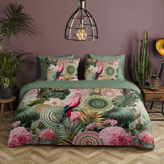 Het Palay dekbedovertrek van HIP Collection brengt kleur en karakter in je slaapkamer. Het groene overtrek is rijk versierd met mandala’s in levendige tinten, omringd door sierlijke bladeren en bloemen in roze en groen. De absolute blikvanger? De felroze papegaai in het midden! Sla je het overtrek een stukje om, dan ontdek je de groene achterzijde met een subtiele grafische print. De bijpassende kussenslopen tonen beide dessins, waardoor je naar hartenlust kunt mixen en matchen voor een speelse look.