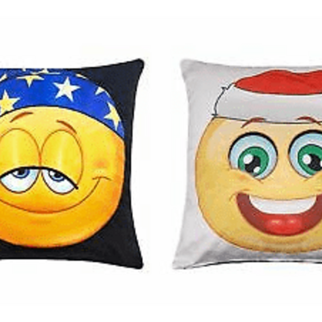 Sierkussen met een print van een Emoji, aan de ene kant een Emoji met kerstmuts en de andere kant een slaapmuts. Lees meer.