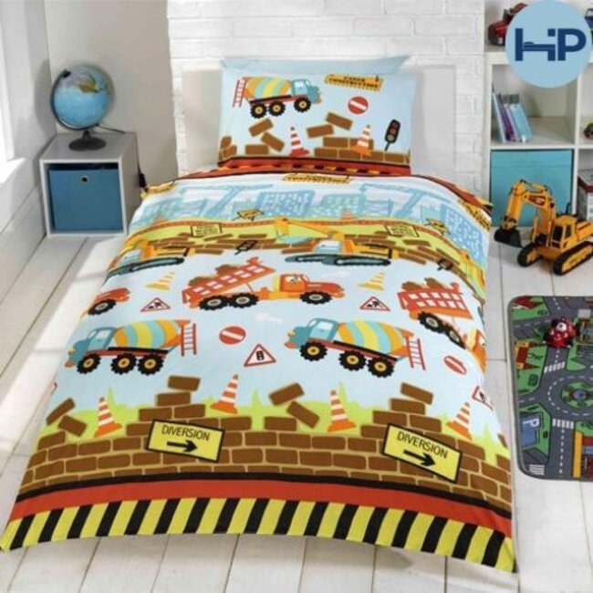Kinder dekbedovertrek Under Construction met verschillende vrachtwagens waaronder een betonmolen en graafmachine. Een helder en funky ontwerp voor de werkplaats voor alle kleine bouwers die er zijn, bedrukt met gedurfde en briljante kleuren op superzachte, gemakkelijk te onderhouden polykatoenstof.