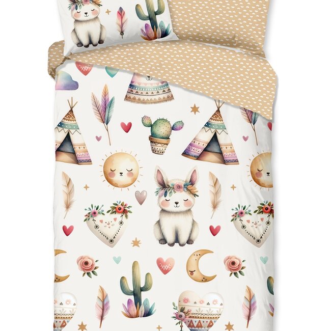 Good Morning kinderdekbedovertrek van 100% katoen met de afbeeldingen van tipi's, konijntjes, hartjes, cactussen en manen. Lees meer.