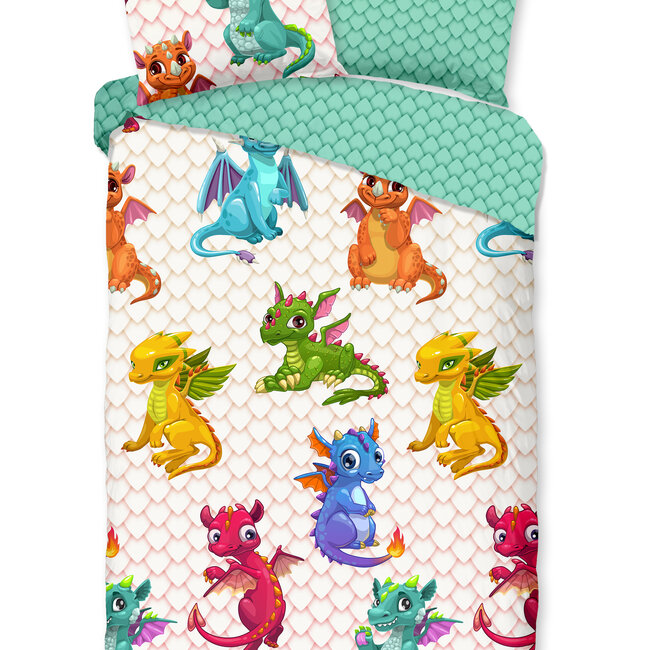 Is jouw kind soms ook net een kleine draak? Dan is het Dragons dekbedovertrek van Good Morning perfect. Het overtrek staat vol kleine draakjes in vrolijke kleuren. Jouw kleine zal de mooiste avonturen beleven in zijn dromen met deze magische wezentjes. De draakjes schitteren op een lichte ondergrond van drakenschubben. Ook de achterzijde van het en de kussenslopen hebben drakenschubben, maar dan in mintgroen.