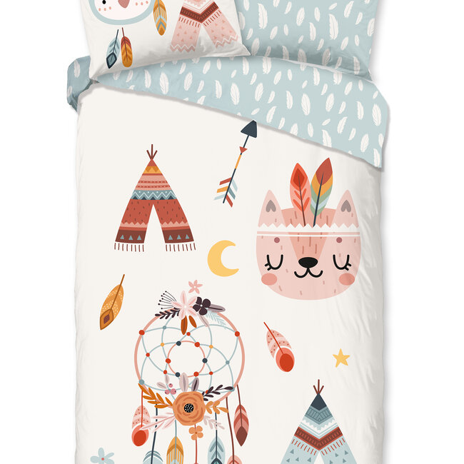 Val elke avond heerlijk in slaap onder het Good Morning Dreamy flanellen dekbedovertrek. Het witte dessin is vrolijk versierd met kleurrijke tipi-tenten en een grote dromenvanger, die waakt over jouw mooiste dromen. De achterzijde van het overtrek is lichtblauw met een sierlijke print van witte veertjes, wat zorgt voor een zachte, dromerige sfeer. Dankzij de dubbelzijdige print kun je eenvoudig afwisselen voor een speels en sfeervol effect in je slaapkamer.
