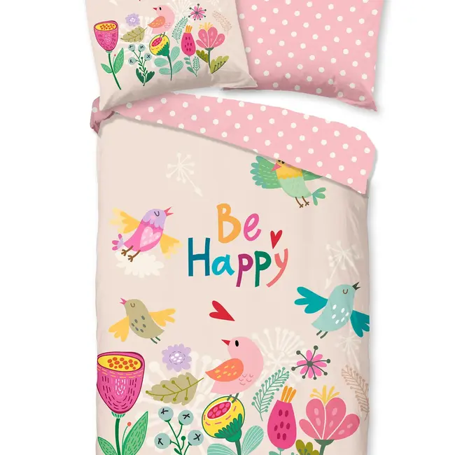 Met dit overtrek kies je voor stijl, vrolijkheid én praktisch gemak. De lieflijke print met vogels, bloemen en de inspirerende tekst “Be Happy” straalt positiviteit uit en maakt het slaapritueel nóg leuker. De effen onderzijde met witte stippen zorgt voor rust in het totaalbeeld en maakt combineren met andere slaapkameraccessoires eenvoudig. Dankzij de hoogwaardige 100% katoen kwaliteit geniet je van een ademend, huidvriendelijk slaapklimaat. De instopstrook zorgt dat het dekbedovertrek netjes op zijn plek blijft en je hebt langdurig plezier dankzij kleurvastheid en wasgemak. Kortom: een slimme en vrolijke keuze voor elke kinderkamer vol sfeer en comfort.